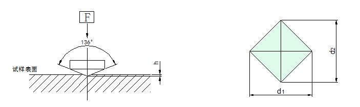維氏硬度試驗(yàn)是用136°正菱形金剛石壓頭,以規(guī)定試驗(yàn)力(F)壓入被測試物體的表面,經(jīng)規(guī)定的保持試驗(yàn)力時(shí)間后,卸除試驗(yàn)力,用測微目鏡測量試件表面的壓痕對角線(d),計(jì)算壓痕的錐形表面積所承受的平均壓力(N/mm2),即維氏硬度值。(詳見圖1.1)。