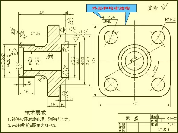 這類零件的基本形狀是扁平的盤狀,一般有端蓋、閥蓋、齒輪等零件,它們的主要結(jié)構(gòu)大體上有回轉(zhuǎn)體,通常還帶有形狀的凸緣、均布的圓孔和肋等局部結(jié)構(gòu)。在視圖選擇時,一般選擇過對稱面或回轉(zhuǎn)軸線的剖視圖作主視圖
