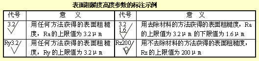 表面粗糙度高度參數(shù)Ra、Rz、Ry在代號中用數(shù)值標注時,除參數(shù)代號Ra可省略外,其余在參數(shù)值前需標注出相應(yīng)的參數(shù)代號Rz或Ry,標注示例