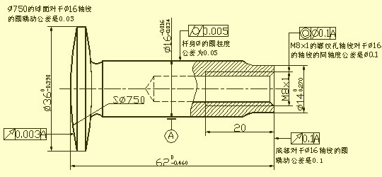一根氣門閥桿,在圖中所標注的形位公差附近添加的文字,只是為了給讀者作說明而重復(fù)寫上的,在實際的圖樣中不需要重復(fù)注寫。
