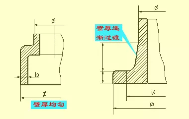 當(dāng)鑄件的壁厚不均勻時,鑄件在澆鑄后,因金屬冷卻速度不同,將產(chǎn)生裂紋和縮孔現(xiàn)象。因此,鑄件的壁厚應(yīng)盡量均勻,見上圖;當(dāng)采用不同壁厚連接時,應(yīng)采用逐漸過渡的方式,見上圖。鑄件的壁厚尺寸一般采用直接注出。