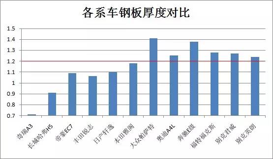 從整體來看我們可以發(fā)現(xiàn),表現(xiàn)差的并不是日系車,而恰恰是我們的自主品牌。抽樣調(diào)查的幾個自主品牌汽車鋼板厚度平均值均僅在1mm上下,而有些品牌車型的鋼板厚度平均值甚至還不到1mm。